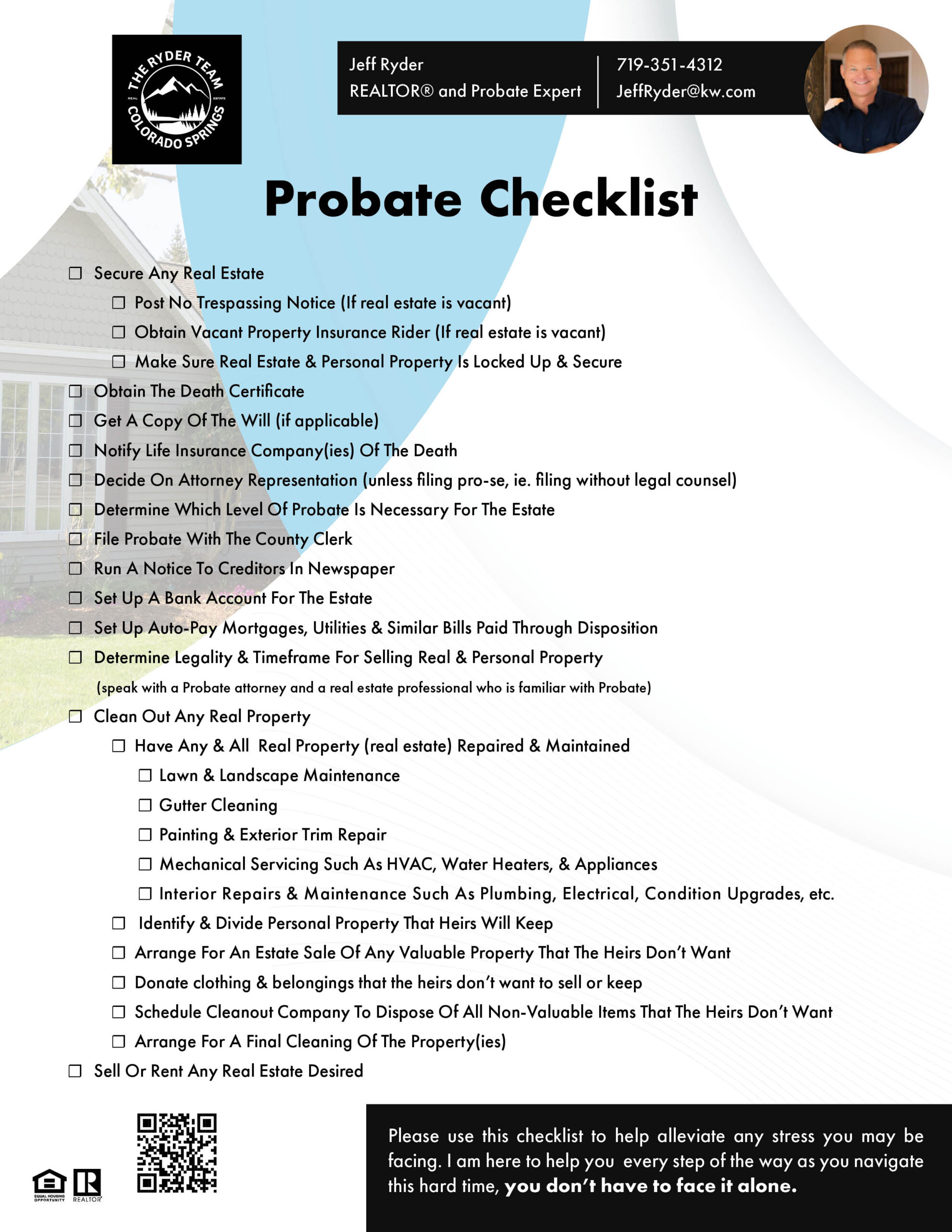 This is a checklist of some of the most common steps required when working though a probate case. While you should always consult an attorney to verify local and state laws and proceedings, this guide is an incredible resource to keep on hand.